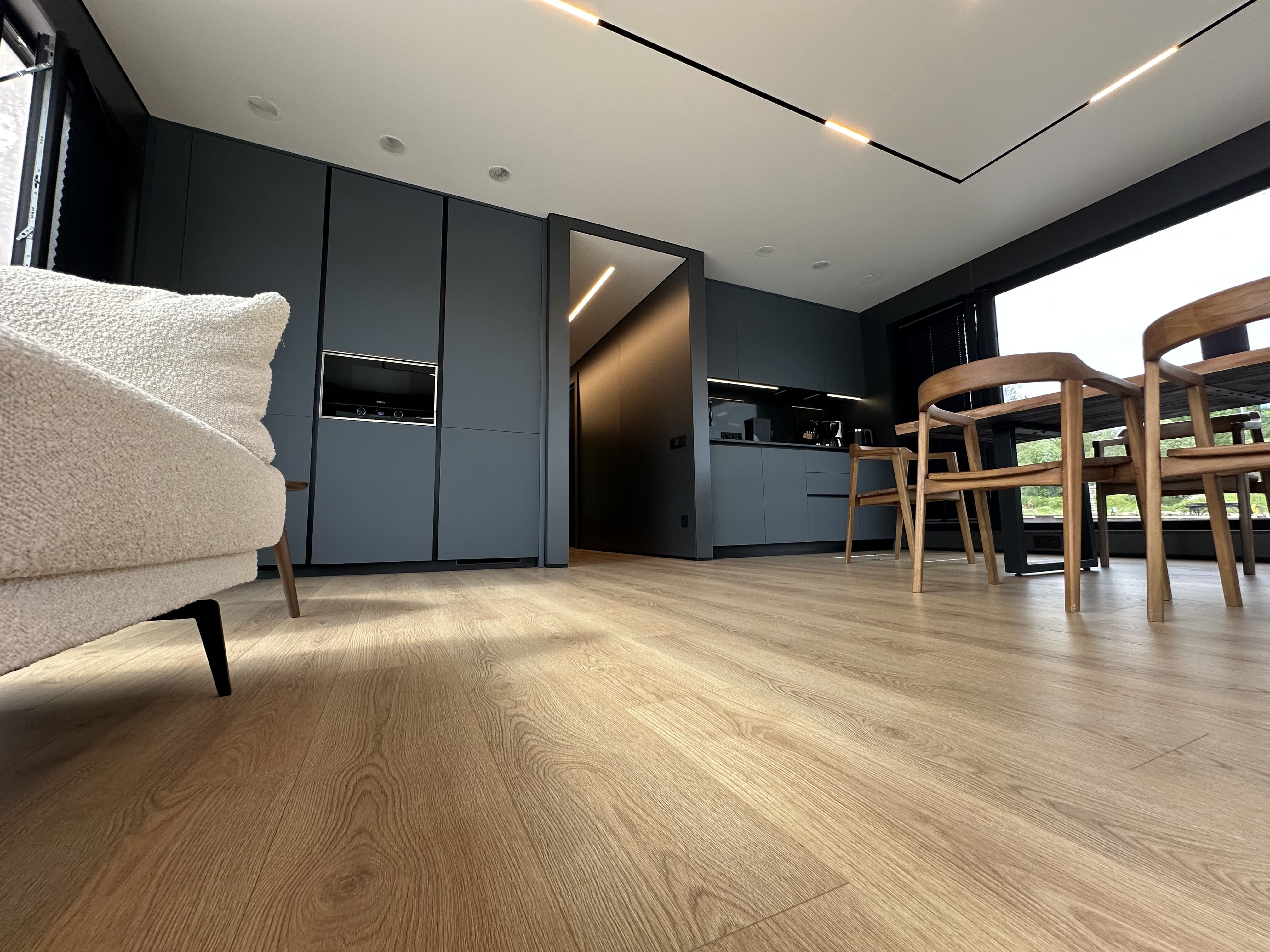 Плитку и керамогранит любят за то, что этот материал можно укладывать без порогов на довольно большой площади. Но и Stone Floor, благодаря его свойствам, может быть смонтирован без порогов на площади до 240 м2 в многокомнатном пространстве. Нет ограничений: не ставить на него тяжелую мебель, кухонные острова, шкафы-купе и стеллажи с книгами, как это запрещают производители обычного ламината и кварц-винила. Это уникальное свойство Stone Floor также имеет лабораторное подтверждение.